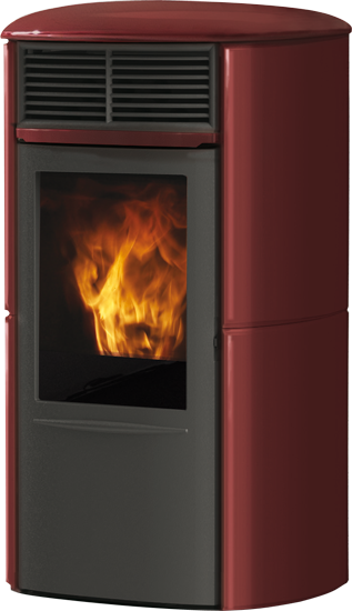 Estufa de pellet con laterales, tapa y aplicación de cerámica en cuatro variantes de color: gris, pergamino, blanco nata y burdeos.