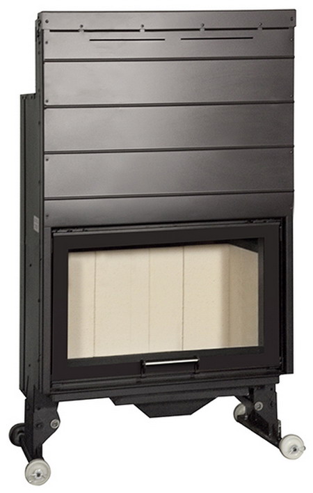 Bloque Mod. Open 800 Puerta Escamoteable ( Acero ). Bloque en acero al carbono con interior en cerámica refractaria. Sistema de apertura de la puerta en guillotina. Control de aire primario. Sistema de doble combustión. Posibilidad de ventilador 400M3/h. 14 Kw. de potencia