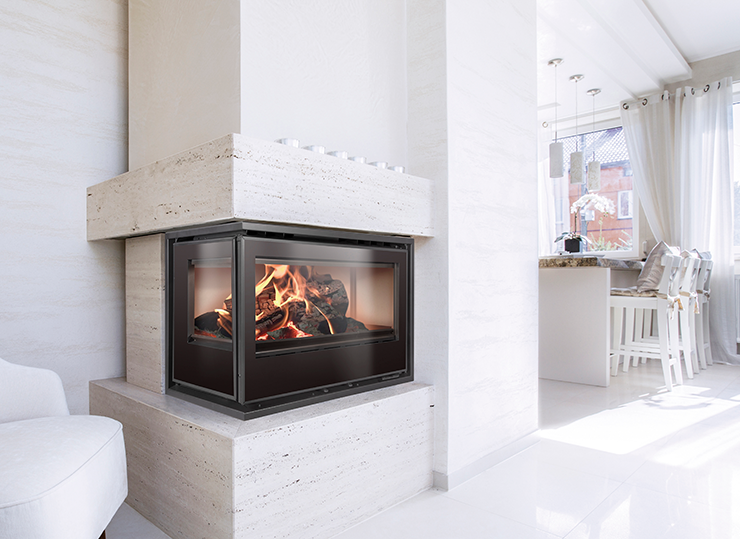 Cassette de chapa con cámara de combustión de acero y piedra refrectaria. Entrada de aire exterior. Hogar estanco. Dispone de dos turbinas. Control de aire primario y secundario. Dispone de sistema de doble combustión. Cristal serigrafiado. Visión del fuego frontal y lateral en cristal negro serigrafiado