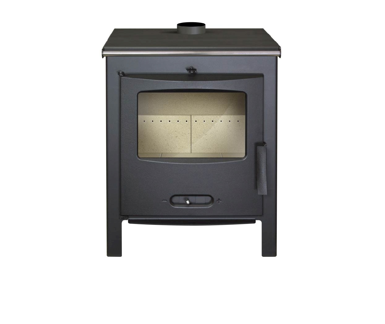 Estufa de leña en acero, potencia con rango de 6 a 12Kw, sistema de cristal limpio. Calienta platos.