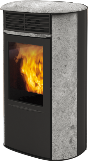 Estufa de pellet con laterales, tapa y aplicación de piedra ollar.